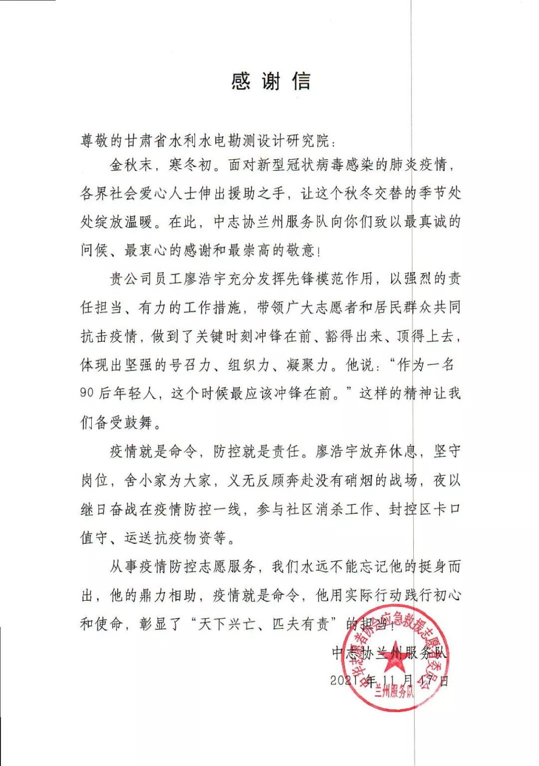 克日,水电设计院收到中志协兰州服务队和团结新村街道天平街社区发来的谢谢信。信中对水电设计院妄想院员工廖浩宇在此次疫情爆发后,自动请缨加入疫情防控服务事情,甘当疫情防控最美逆行者,一连坚持26天自愿者服务的先进事迹体现谢谢。