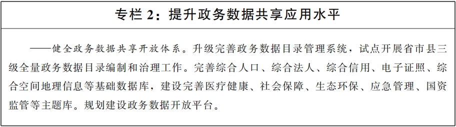 £¨Èý£©½¡È«ÕþÎñÊý¾Ý¹²Ïíϵͳ¡£Î§ÈÆ¡°¸ßЧ°ì³ÉÒ»¼þÊ¡±£¬Íƶ¯ÒÔÅÌÎÊ¡¢ºËÑé¡¢ÅúÁ¿½»Á÷µÈ¶àÔª»¯·½·¨¿ªÕ¹ÕþÎñÊý¾Ý¹²Ïí£¬½¨Éè¿ç²ã¼¶¡¢¿çµØÇø¡¢¿çϵͳ¡¢¿ç²¿·Ö¡¢¿çÓªÒµÕþÎñÊý¾Ý¹²ÏíºÍÓªÒµÐͬϵͳ£¬À©´óÕþÎñÊý¾Ý¹²Ïí½»Á÷ÁýÕÖ¹æÄ£¡£Éý¼¶ÍêÉÆÊ¡¡¢ÊÐÕþÎñÊý¾Ý¹²Ïí½»Á÷ƽ̨£¬¼ÓËÙÍÆ½øÏØÓòÕþÎñÊý¾ÝËѼ¯£¬Ç¿»¯¹ú¼Ò¡¢Ê¡¡¢ÊÐÈý¼¶ÕþÎñÊý¾Ý¹²Ïí½»Á÷ƽ̨Áª¶¯£¬Íƽø¿ç²ã¼¶ÕþÎñÊý¾Ý»ØÁ÷¡£½¨Éè¿çϵͳÐÅÏ¢¹²Ïí»úÖÆ£¬Íƶ¯Ê¡¼¶²¿·ÖÐÅϢϵͳºÍÊ¡Êý¾Ý¹²Ïí½»Á÷ƽ̨Êý¾Ý¿â»¥Í¨¹²Ïí¡£ÍÆ¶¯×Ô¶¯¹²ÏíÓë°´Ðè¹²ÏíÏàÍŽᣬ°´ÆÚÐû²¼ÕþÎñÊý¾Ý¹²ÏíÔðÈÎÇåµ¥¡£