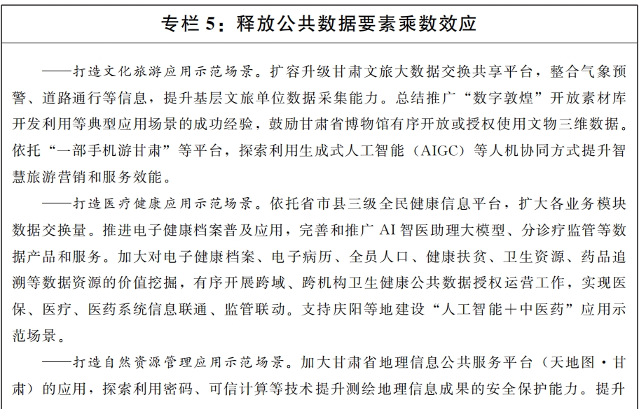 £¨Î壩ÓÐÐò¿ªÕ¹¹«¹²Êý¾ÝÊÚȨÔËÓª¡£Æ¾Ö¤¹ú¼ÒÏà¹Ø»®¶¨£¬ÊÊÊ±ÖÆ¶©¸ÊËàÊ¡¹«¹²Êý¾Ý×ÊÔ´ÊÚȨÔËÓªÖÎÀí»®¶¨£¬Ì½Ë÷ÕûÌåÊÚȨ¡¢·ÖÁìÓòÊÚȨ¡¢ÒÀ³¡¾°ÊÚȨµÈ¶àÖÖÊÚȨÔËӪģʽ¡£åàÑ¡¡¢ÅàÓý¾ß±¸¸ßˮƽÊý¾ÝÔËÓªÊÖÒÕ¡¢Çå¾²°ü¹ÜÄÜÁ¦¡¢Ó¦ÓÃÊ÷ģЧӦµÄÐÐÒµÐÔ¡¢ÇøÓòÐÔ¹«¹²Êý¾ÝÔËÓª»ú¹¹¡£Íƶ¯½¨É蹫¹²Êý¾ÝÊÚȨÔËӪƽ̨£¬È·±£Êý¾Ý×ÊÔ´¿ª·¢Ê¹ÓÃÀú³Ì¿É¹Ü¡¢¿É¿Ø¡¢¿É×·ËÝ¡£ÂÊÏÈÔÚÎÄ»¯ÂÃÓΡ¢Ò½ÁÆ¿µ½¡¡¢×ÔÈ»×ÊÔ´¡¢½»Í¨ÎïÁ÷¡¢ÉúÎïÒ½Ò©¡¢ÏÖ´úũҵ¡¢ÄÜÔ´»¯¹¤¡¢ÆøÏó·þÎñµÈÊý¾Ý×ÊÔ´¸»ºñ¡¢Ó¦ÓÃÐèÇóÆÕ±éµÄÖØµãÐÐÒµºÍÁìÓò£¬´òÔìÒ»Åú¹«¹²Êý¾Ý²úÆ·ºÍ·þÎñ¡£