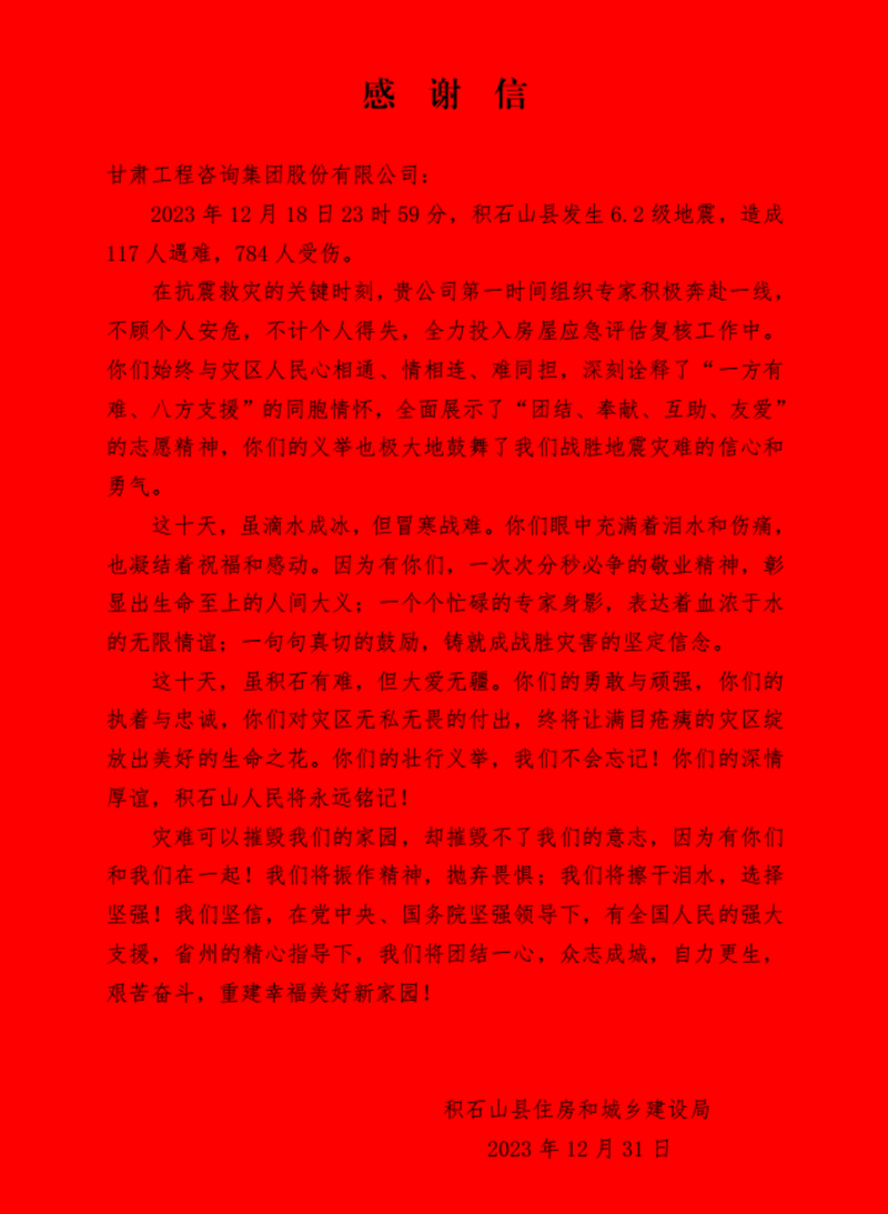 1月3日上午,积石山县住房和城乡建设局向甘肃OG真人官方集团赠予“为黎民不惧艰险,战险情勇猛争先”锦旗,并发来《谢谢信》,对在抗震救灾要害时刻奔赴灾区开展衡宇应急评估事情的专家表达谢谢和敬意。