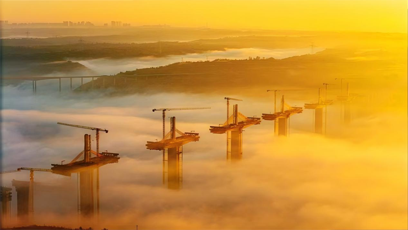 晨光初现,建设中的桥梁在薄雾中若隐若现,跨越河流、毗连两岸,为陇东大地经济腾飞插上同党。