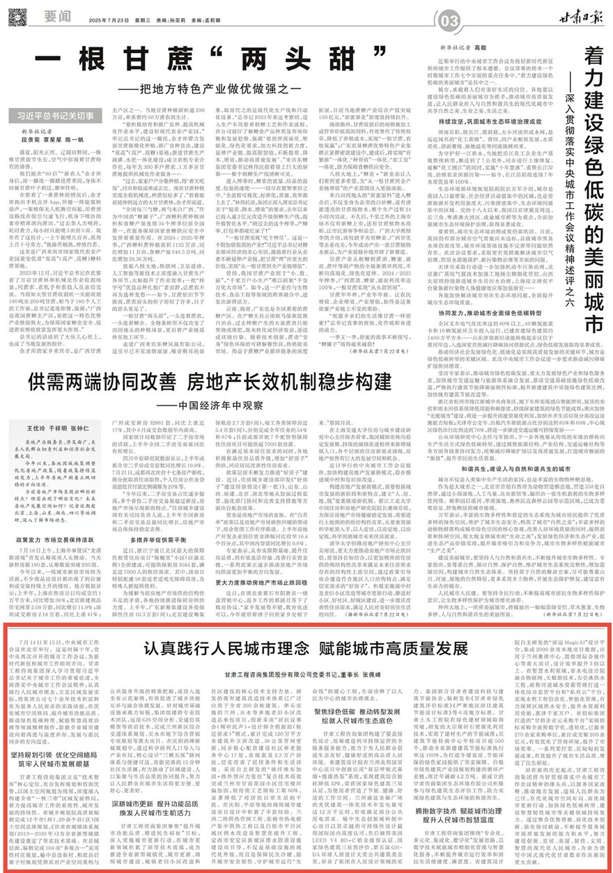 7月14日至15日,中央都会事情聚会在北京举行。这是时隔十年,党中央再次召开的都会事情聚会,为新时代新征程都会事情指明偏向。甘肃OG真人官方集团深入学习贯彻习近平总书记关于都会事情的主要叙述,周全落实中央都会事情聚会精神,认真践行人民都会理念,驻足区域生长现实,将集团公司七十余年手艺积淀转化为服务人民需求的实践动能,在优化都会空间名堂、提升都会功效品质、推动绿色低碳转型、赋能智慧高效治理等领域精耕细作,助推全省都会建设向着高度与温度并存、生长与惠民同步的偏向迈进。