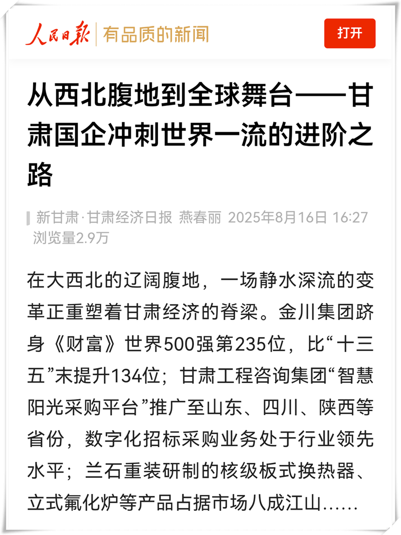 ÔÚ´óÎ÷±±µÄÁÉÀ«ÒªµØ£¬Ò»³¡¾²Ë®ÉîÁ÷µÄÀå¸ïÕýÖØËÜןÊËྼõļ¹Áº¡£½ð´¨¼¯ÍÅõÒÉí¡¶²Æ²ú¡·ÌìÏÂ500Ç¿µÚ235룬±È¡°Ê®ÈýÎ塱ĩÌáÉý134λ£»¸ÊËàOGÕæÈ˹ٷ½¼¯ÍÅ¡°ÖÇ»ÛÑô¹â²É¹ºÆ½Ì¨¡±ÍƹãÖÁɽ¶«¡¢ËÄ´¨¡¢ÉÂÎ÷µÈÊ¡·Ý£¬Êý×Ö»¯Õбê²É¹ºÓªÒµ´¦ÓÚÐÐÒµÁìÏÈˮƽ£»À¼Ê¯ÖØ×°ÑÐÖÆµÄºË¼¶°åʽ»»ÈÈÆ÷¡¢Á¢Ê½·ú»¯Â¯µÈ²úÆ·Õ¼ÓÐÊг¡°Ë³ÉɽºÓ¡¡