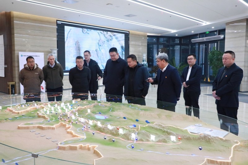 李文生一行实地观察了省水电设计院鱼儿沟科研设计基地,现场观摩了甘肃省水网建设沙盘演示。