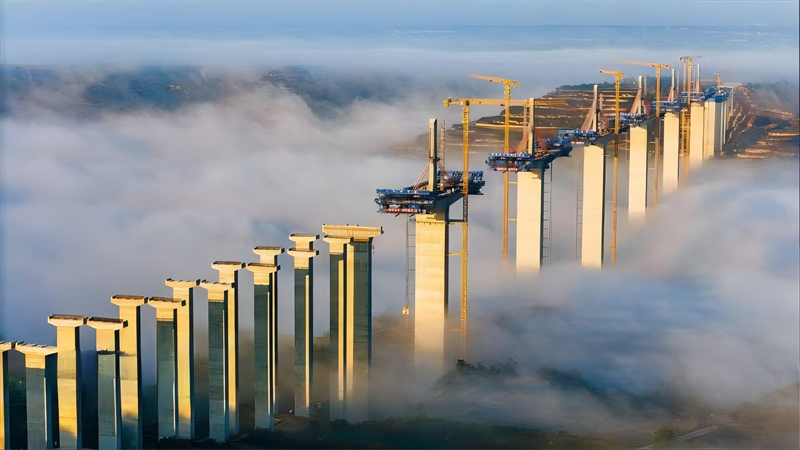 晨光初现,建设中的桥梁在薄雾中若隐若现,跨越河流、毗连两岸,为陇东大地经济腾飞插上同党。