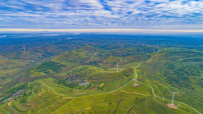 梯田蜿蜒升沉,墟落狼籍有致,云海绵延一直,风车悠然旋转,织就了人与自然协调共生的漂亮画卷。