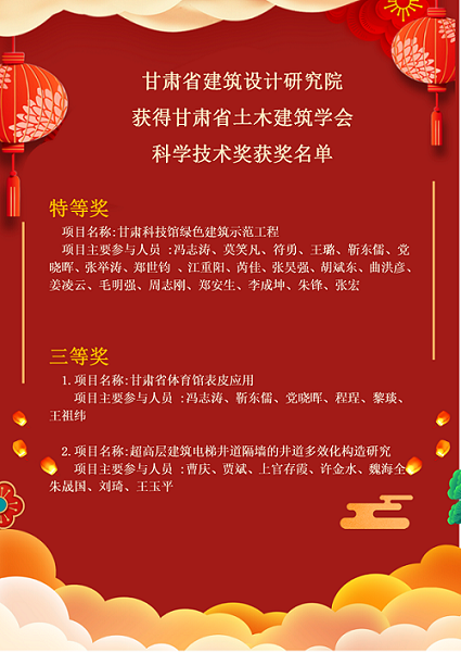克日,从甘肃省土木修建学会传来好新闻,修建设计院选送的“甘肃科技馆绿色修建树模工程”“甘肃省体育馆表皮应用”“超高层修建电梯井道隔墙的井道多效化结构研究”等项目被该学会划分授予科学手艺奖特等奖和三等奖。