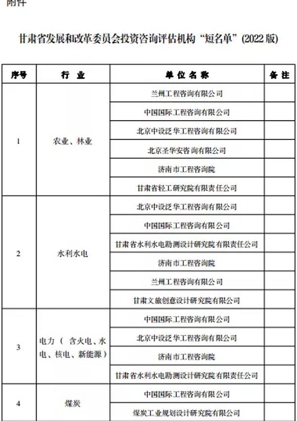 克日,省发改委宣布2022年进入省发改委投资咨询评估机构企业名单,甘肃省水利水电勘探设计研究院有限责任公司乐成入围三个行业板块。