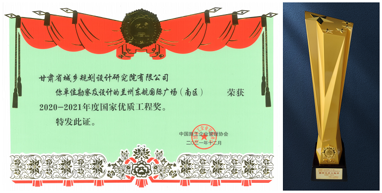 甘肃省垣乡妄想设计研究院勘探、设计的“兰州东航国际广场(南区)项目”荣获“2020—2021年度国家优质工程奖”。此前,该项目已荣获2020年工程建设项目绿色制作设计水平评价三等效果、2020年度甘肃省优异工程勘探设计三等奖等多项声誉。