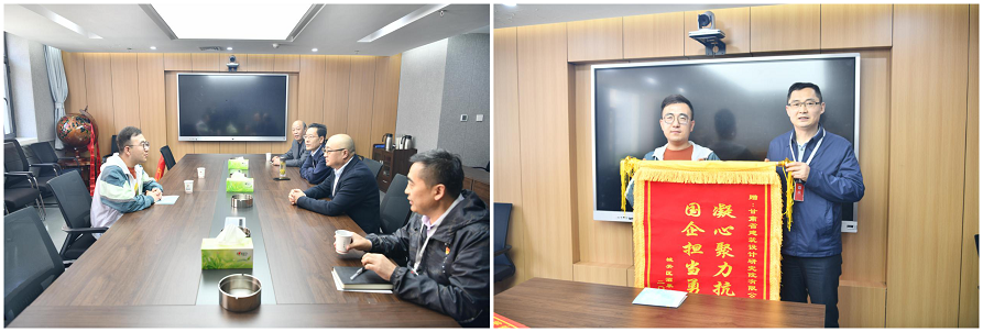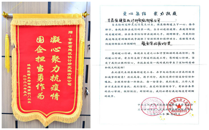 5月16日,甘肃省修建设计研究院有限公司收到了来自兰州市城关区酒泉路街道送来的谢谢锦旗,锦旗上誊写着“凝心聚力抗疫情 国企继续勇作为”。修建设计院党委书记李向军、总司理曹庆、纪委书记丁永升及党群事情部相关认真人接待来访。
