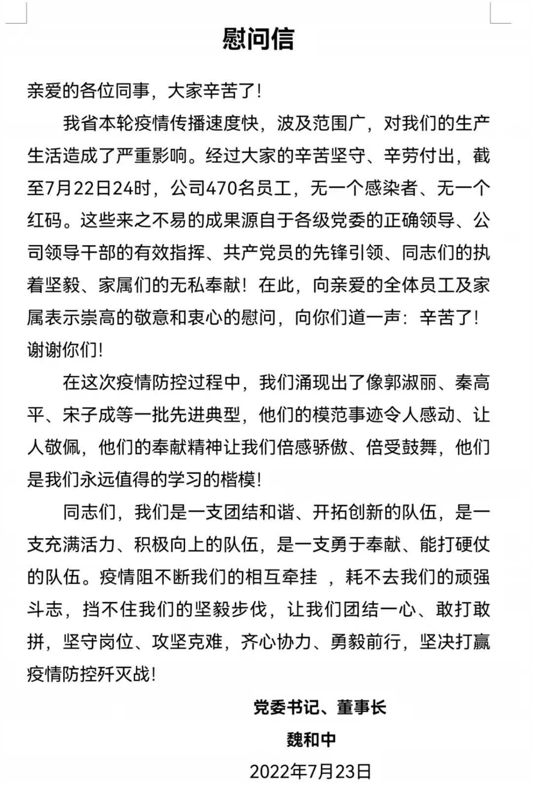 克日,甘肃省建设监理有限责任公司党委书记、董事长魏和中向全体职工发出慰问信,对在疫情时代值守项目一线和抗战疫情一线的党员干部职工致以最真挚的体贴和谢谢。同时,招呼全体干部职工向疫情防控时代涌现出的一线先进典范小我私家和共产党员先锋者学习,团结一心、敢打敢拼,坚守岗位、攻坚克难,同心协力、勇毅前行,坚决打赢疫情防控杀绝战。
