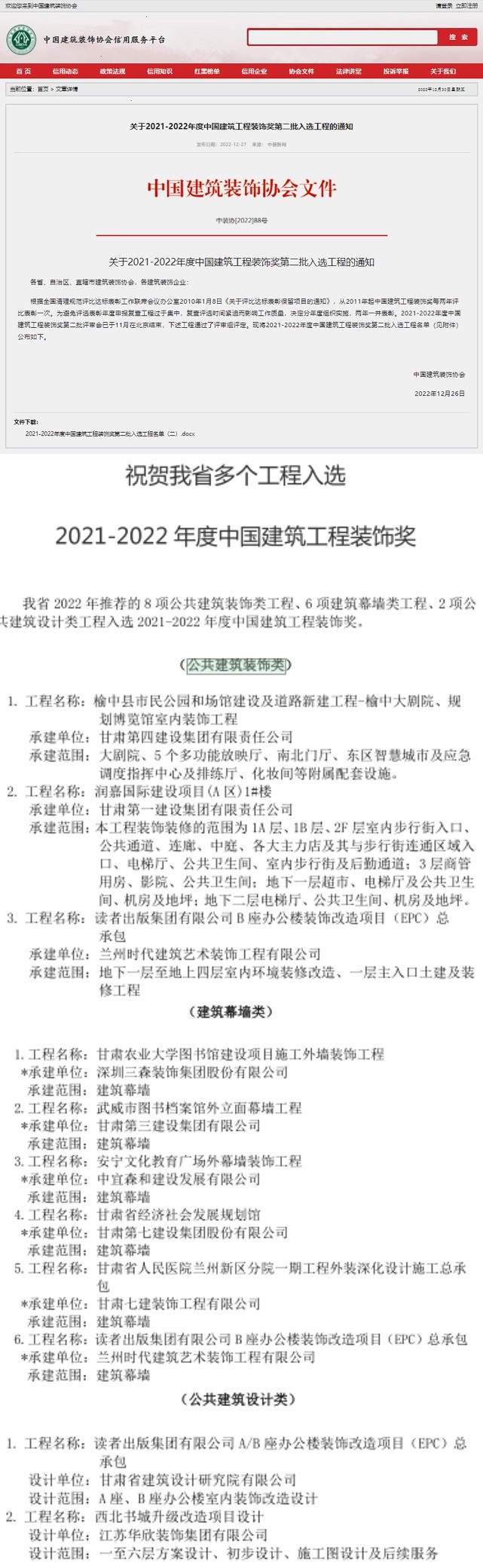 日前,2022年中国修建工程装饰奖评选效果揭晓,甘肃省修建设计研究院有限公司多个项目榜上著名。其中,“甘肃省修建设计研究院有限公司办公楼消防刷新及办公情形提升刷新项目”荣获公共修建装饰类奖项;“读者出书集团有限公司A/B座办公楼装饰刷新项目”划分荣获修建幕墙类、公共修建装饰类和公共修建设计类3项奖项。值得一提的是,修建设计院子公司兰州时代修建艺术装饰工程有限公司在此次获奖中接连斩获了3个奖项。阻止现在,该公司已经累计获得7项中国修建工程装饰奖奖项。