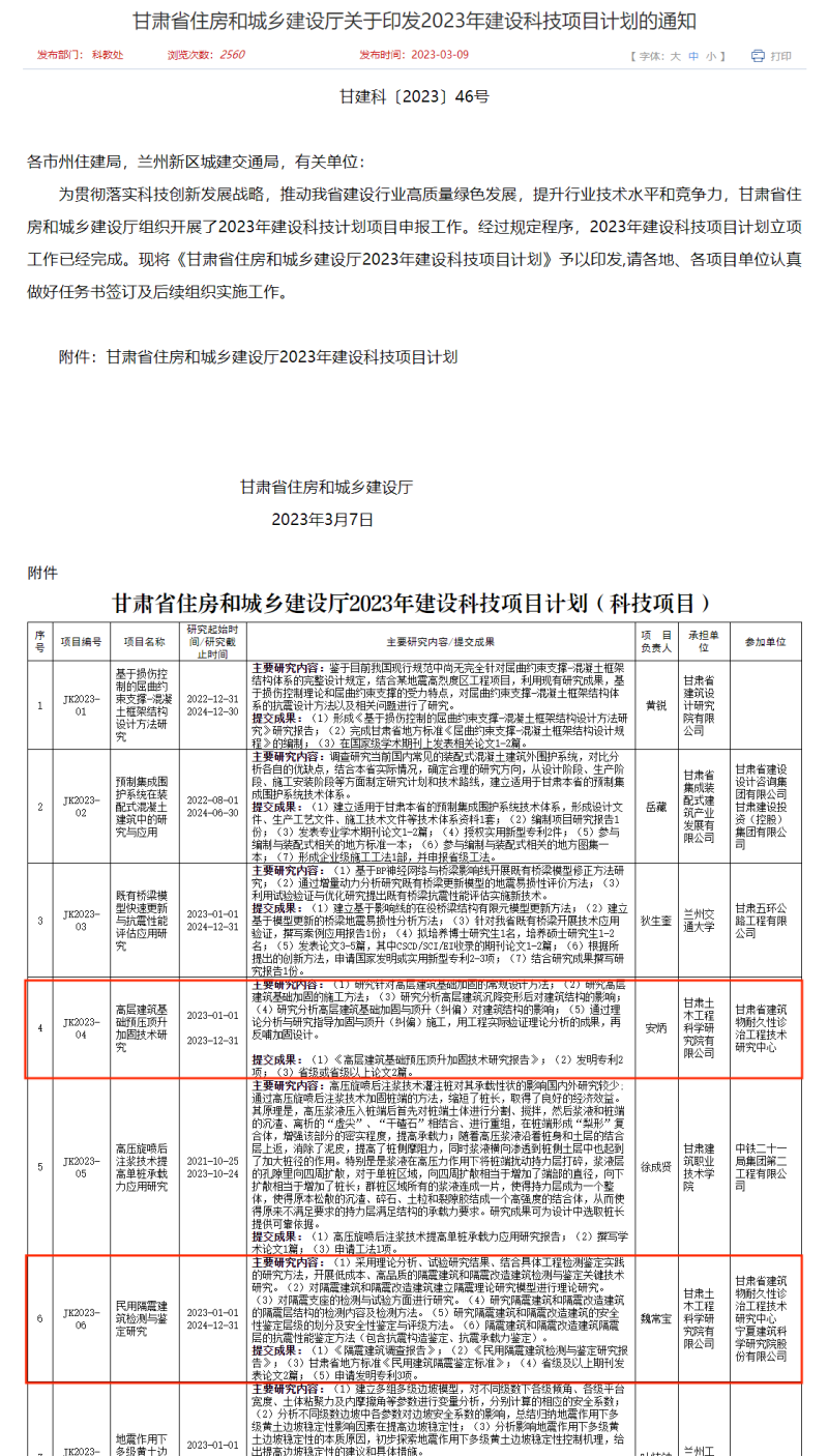 克日,从《甘肃省住房和城乡建设厅关于印发2023年建设科技项目妄想的通知》(甘建科〔2023〕46号)获悉,由土木匠程院组织申报的两项科技攻关项目《高层修建基础预压顶升加固手艺研究》(立项编号JK2023-03)、民用隔震修建检测与判断研究(立项编号JK2023-06)和两项软课题《2022-2023年度甘肃省民用修建能耗统计数据剖析与研究》(立项编号JK2023-45)、《2022年度甘肃省修建能耗监测平台的能耗数据剖析与研究》(立项编号JK2023-46)乐成获批立项。