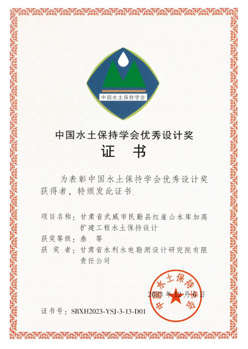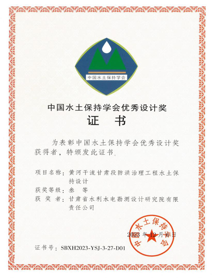 据悉,这是继《甘肃省引洮供水一期工程水土坚持设计》获第三届中国水土坚持学术大会优异设计二等奖后,再次喜获此奖项。中国水土坚持学术大会制度自2018年建设以来,中国水土坚持学会搭建了我国水土坚持领域规模最大、水平最高的学术交流平台,现已成为中国水土坚持学术交流的主要品牌。中国水土坚持学会优异设计奖每两年评选一次,主要奖励我国在水土坚持妄想与设计领域中手艺先进、效果显著、理念立异的项目效果。