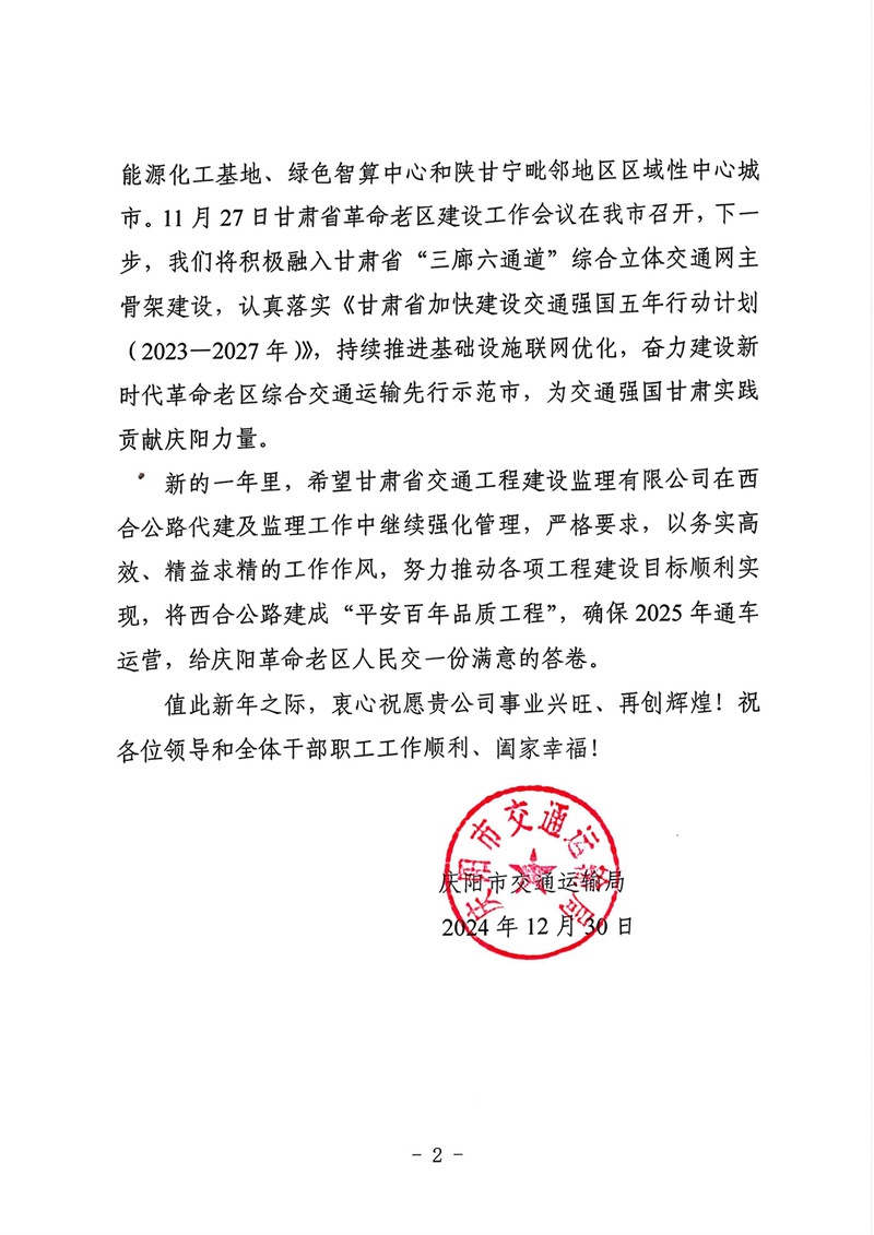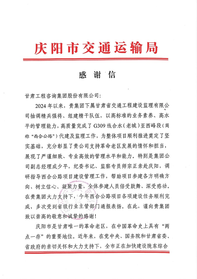 12月30日,甘肃OG真人官方集团收到庆阳市交通运输局的谢谢信,向省交通监理公司在G309线合水(老城)至西峰段公路项目建设历程中作出的孝顺体现谢谢。