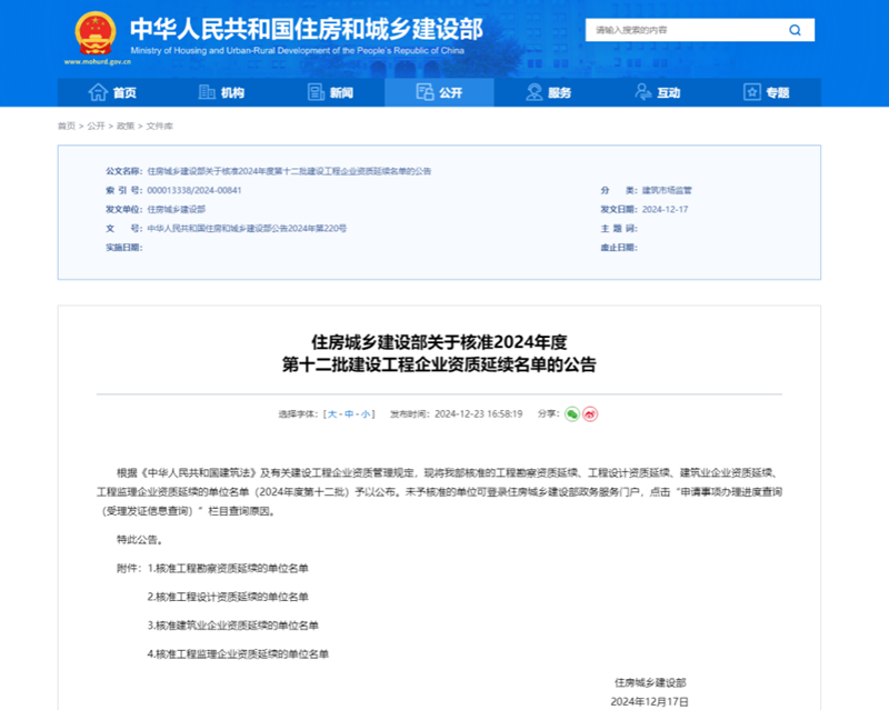克日,住房城乡建设部正式宣布了《关于批准2024年度第十二批建设工程企业资质延续名单的通告》。省修建设计院修建行业甲级、景物园林工程设计专项甲级、市政行业(给水工程)专业甲级、市政行业(热力工程)专业甲级资质通过批准延续。